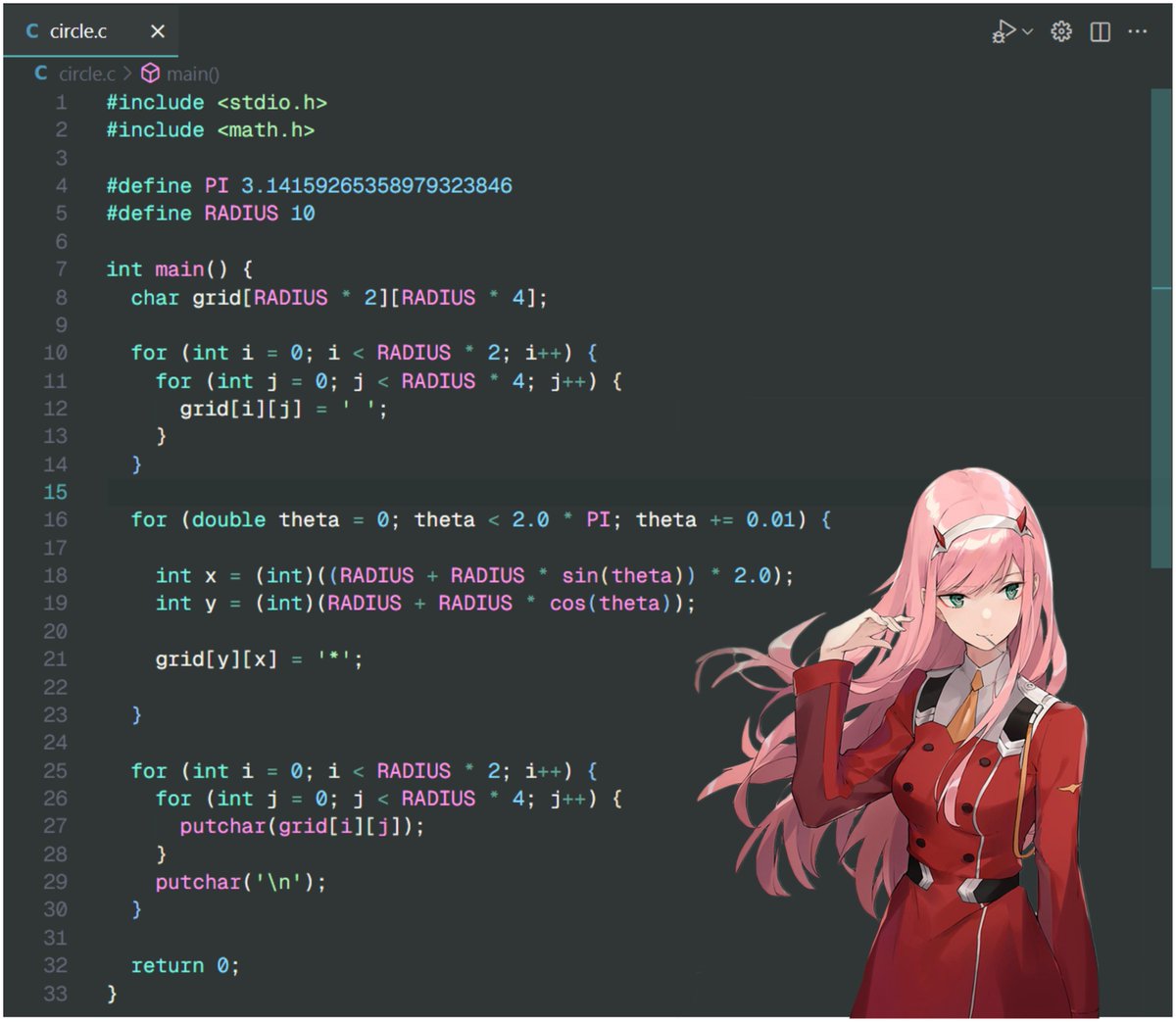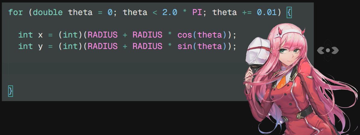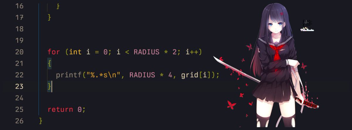 why radius 4 cols? because while printing, an ascii character has height = width 2, so we need double number of cols else our circle will be an oval